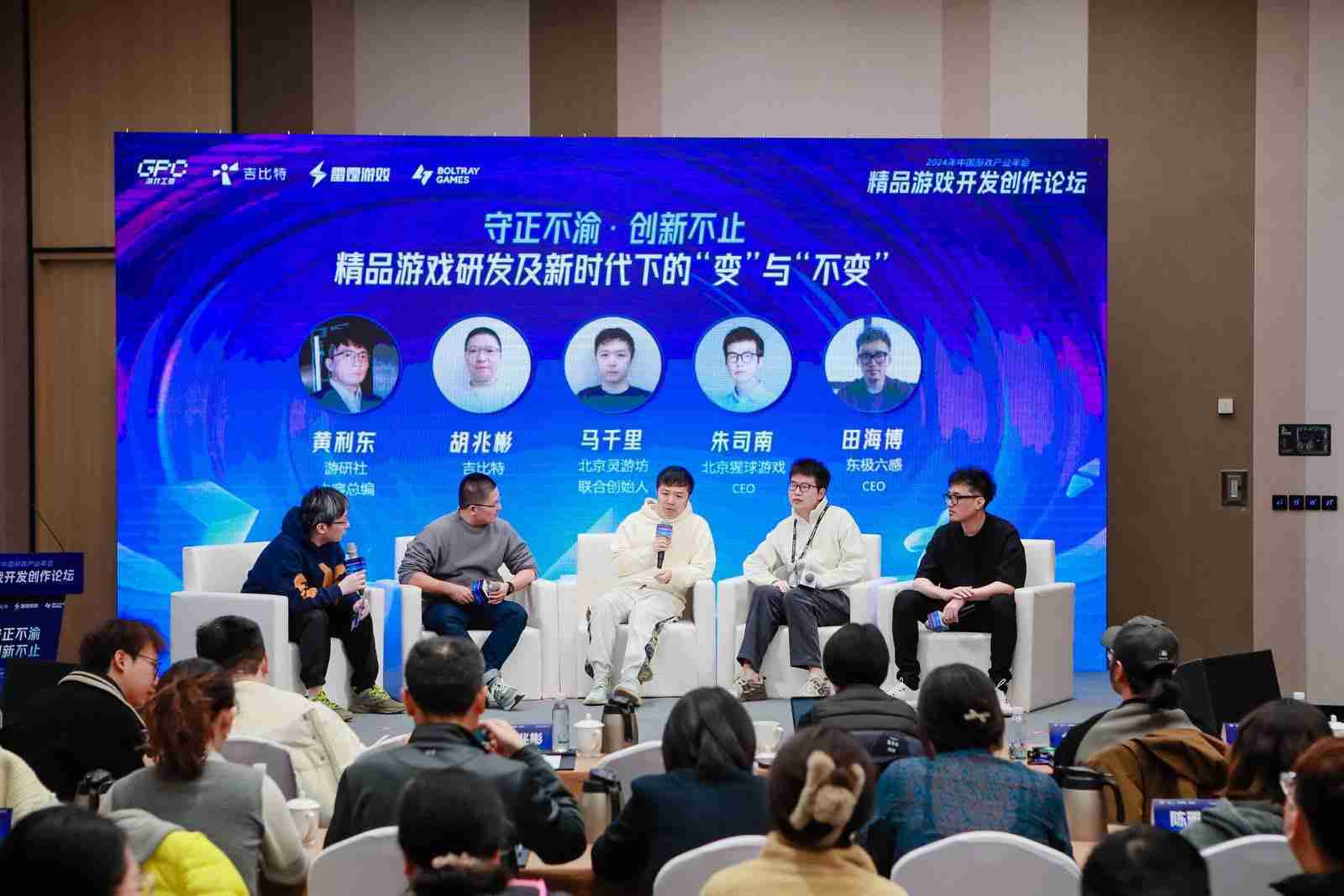圆桌对话环节,,在游研社内容总编黄利东的主持下,,,,918.comCTO胡兆彬、、北京灵游坊联合创始人马千里、、北京猩球游戏CEO朱司南、、、东极六感CEO田海博等四位嘉宾围绕“守正不渝、、、创新不止——精品游戏研发及新时代下的‘变’与‘不变’”这一主题分享了各自在精品游戏开发理念及工程能力搭建方面的见解和经历,,,,并就行业变化下游戏人需要坚守的理念等展开交流探讨。。