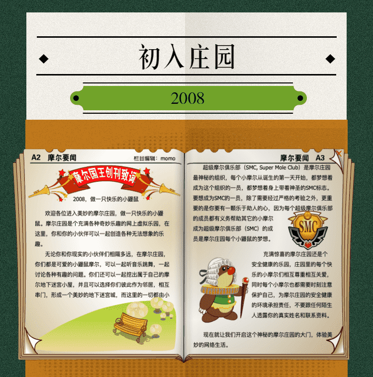 在这一年,,摩尔庄园诞生了。。在这里,,大家都是可爱的红鼻子鼹鼠小摩尔,,,可以一起勤劳耕作,,一起高山滑雪......我们都是摩尔庄园的建设者。。