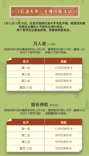 除了“油王”争霸赛,,精英主播招募活动亦同步开启!!!赛事分时长奖和人气奖,,,奖励同样丰厚!!